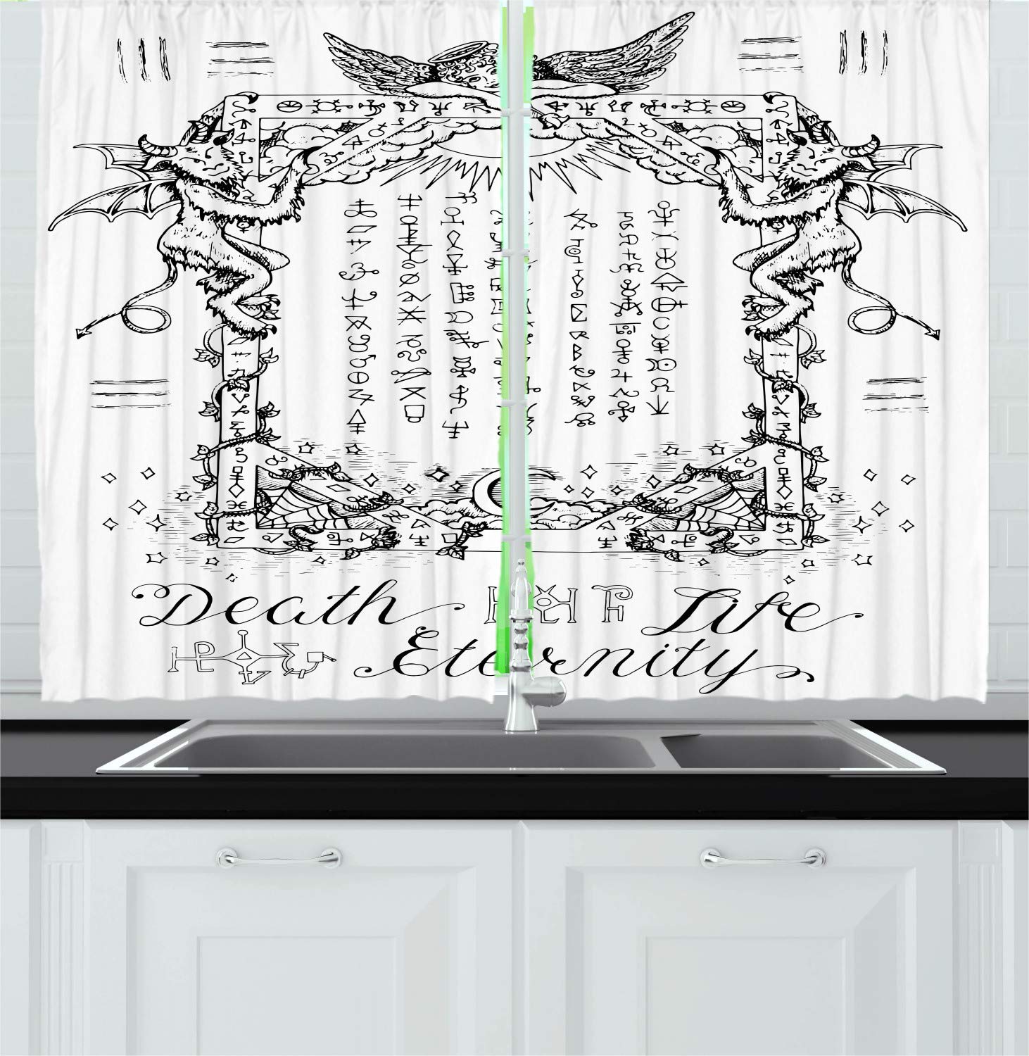 Amazon Com Ambesonne Occult Kitchen Curtains Gothic Medieval Magic And Spell Eternal Life Chart Themed Artwork Window Drapes 2 Panel Set For Kitchen Cafe Decor 55 X 39 White Black Home